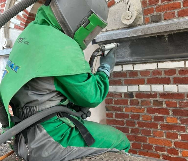Wij begrijpen dat historische gebouwen en natuursteen niet zomaar oppervlakken zijn, maar dragers van cultuur en karakter. Daarom passen wij onze unieke luchtgomtechniek met waterinjectie toe — ontwikkeld om te reinigen zonder te beschadigen.